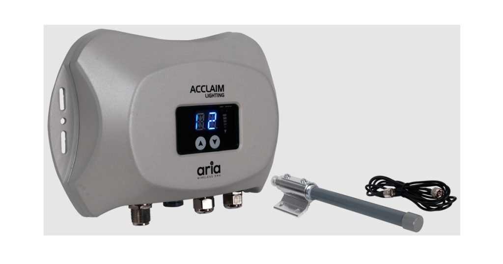 According to Giardina, Aria wireless is a compact, local, outdoor-rated wireless DMX system. It can function as either the sending or receiving point, allowing users to select up to 15 channels on the 2.4 GHz band. The internal wireless radio features both automatic networking and signal routing optimization to ensure the best possible reception of DMX data. A 5dB, omni-directional antenna is included to provide transmission up to 2600 ft line of sight and 300 ft between obstructions and walls.